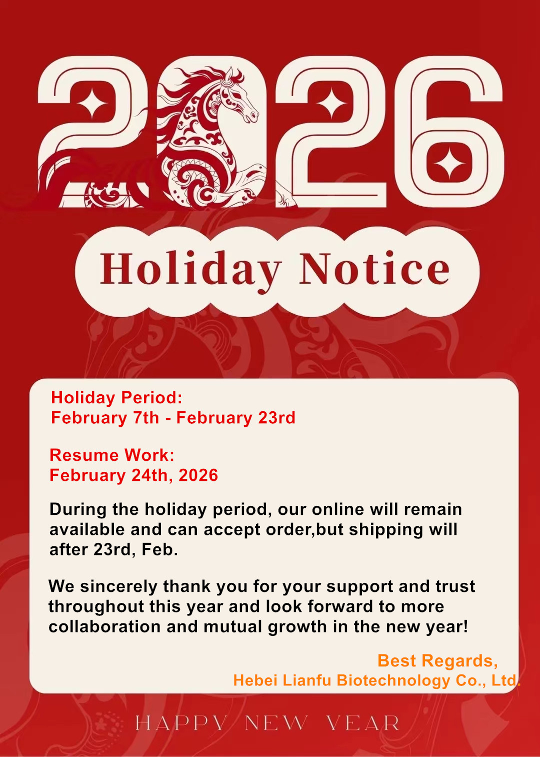 2026 Chinese New Year Holiday Notice